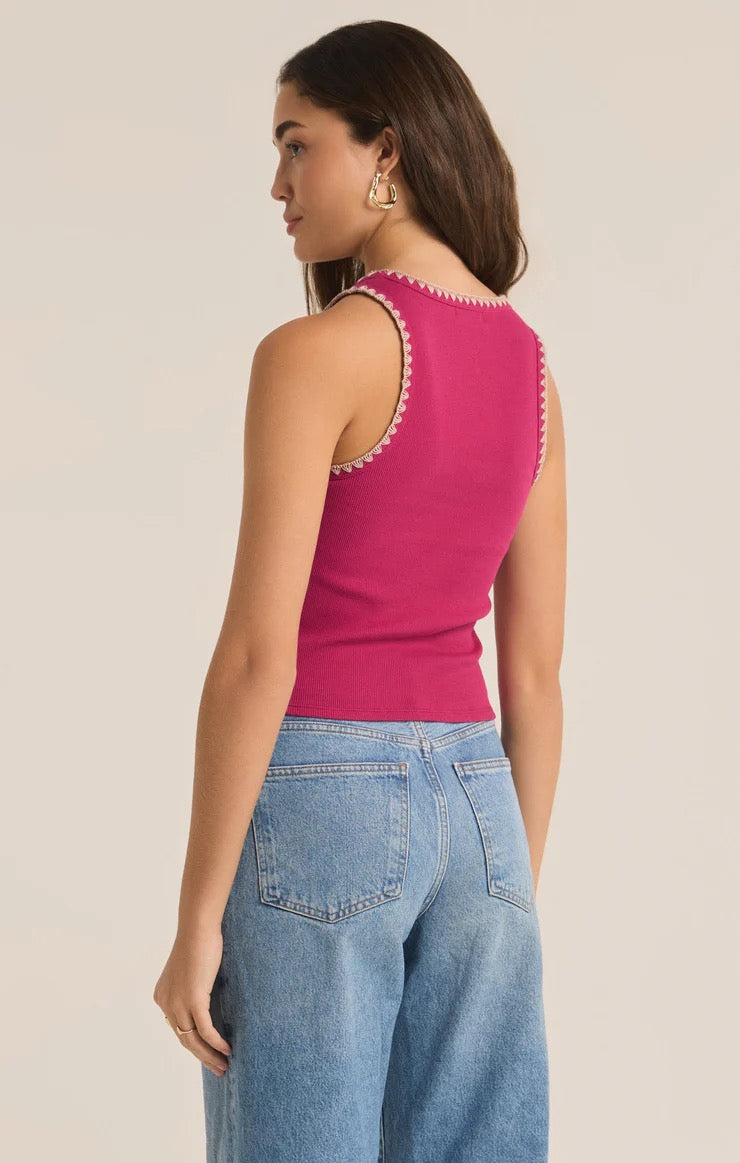 This standalone top is a must-have in every wardrobe. Made using our softly textured rib fabric, this fitted and flattering tank features novelty embroidered whipstitch detailing at the hem that makes it stand out from the rest.