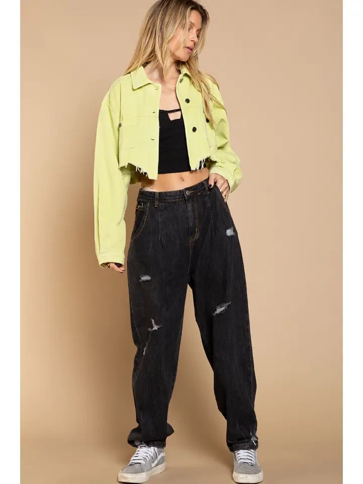Designed in cropped jacket with button closure, relaxed fit, balloon sleeve with button closure, chest pockets on front, distressed edge detailing, small patch with STAR embroidery on back, featured in corduroy.