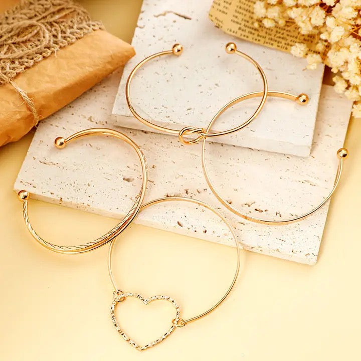 This bracelet set oozes charm with its heart and knot design, shines with its plated finish, adds dimension and flair with its layered construction, and brings a fresh spin with its open cuff style.