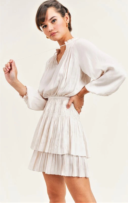 Introducing the Lana Dress, featuring a chic V-neck and delicate ruffle band collar with collar tie closure. The loose fit bubble top create a relaxed yet elegant silhouette, while the ruched shoulders and balloon sleeves add a touch of sophistication. The smocked waist and layered pleated skirt evoke luxury, while the silky satin fabric gives a premium feel.