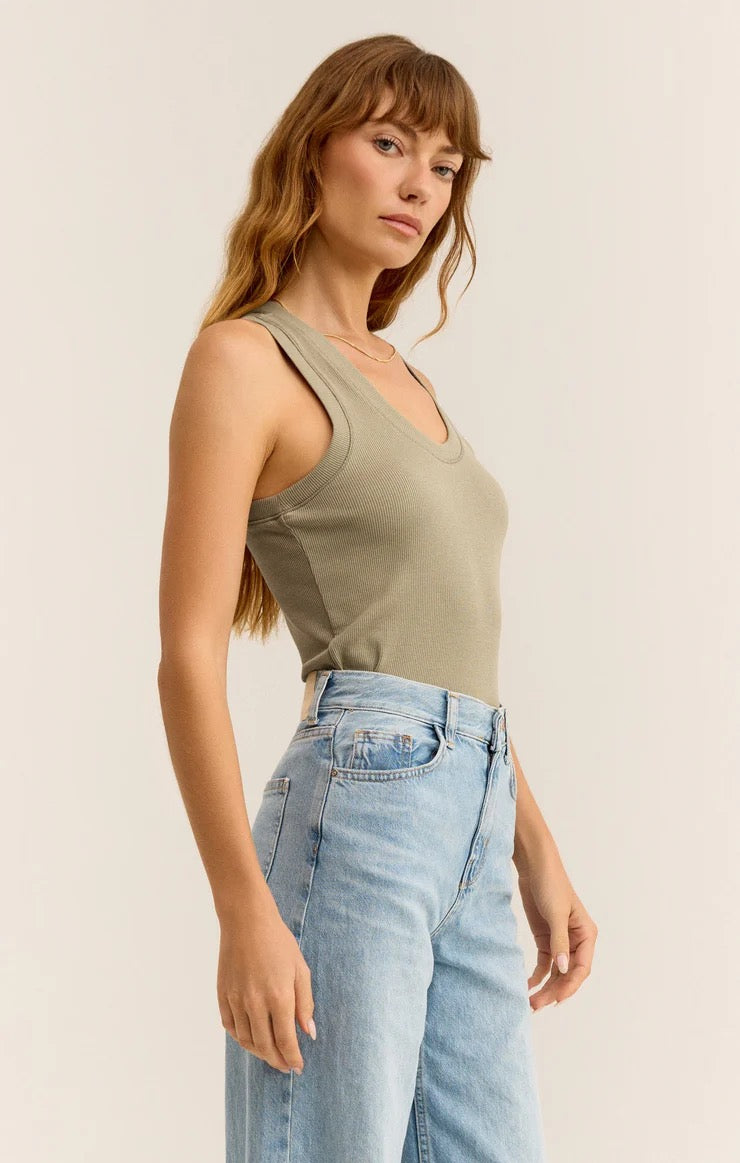One of our most popular Essential tanks, made of our softly textured feather rib fabric, is a must-have whether worn on its own or as a fitted layer. We love this basic bra-friendly tank tucked or untucked.