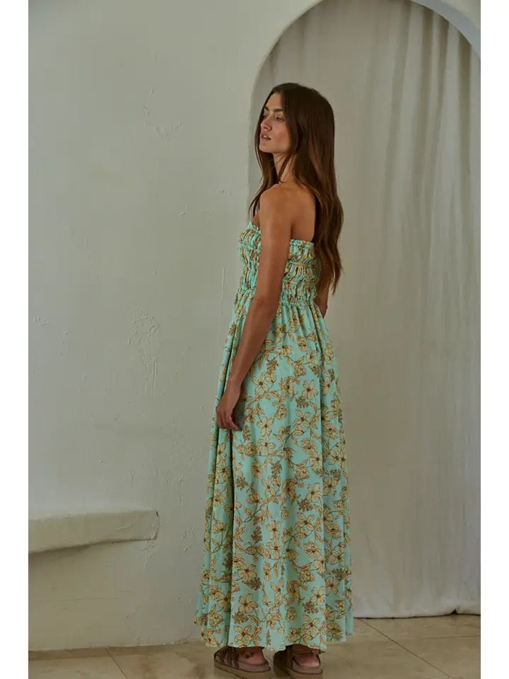 Woven Cotton Rayon Floral Print Smocked Tube Neck Strapless Flare Maxi Dress With Rayon Lining