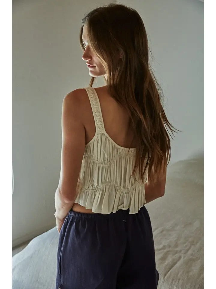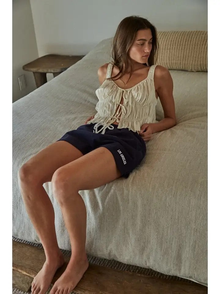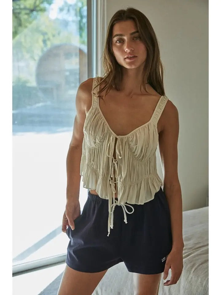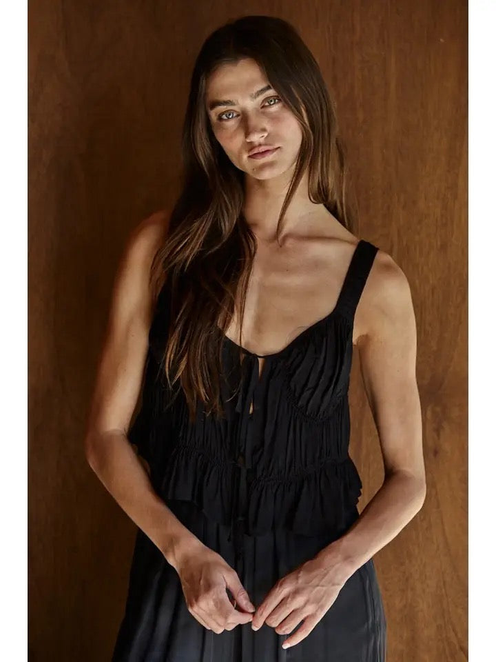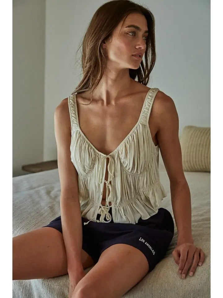Woven Rayon Plunged V-Neck Sleeveless Smocked Top With Front Tie Straps